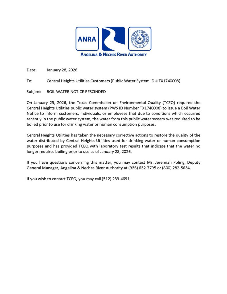 January 25, 2026Boil Water Notice Rescinded for Central Heights Utilities