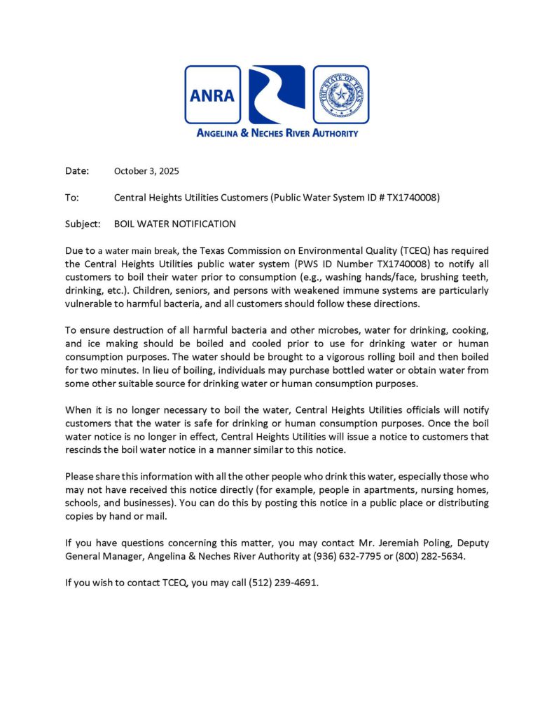 BOIL WATER NOTICE ISSUED for Central Heights Water Customers